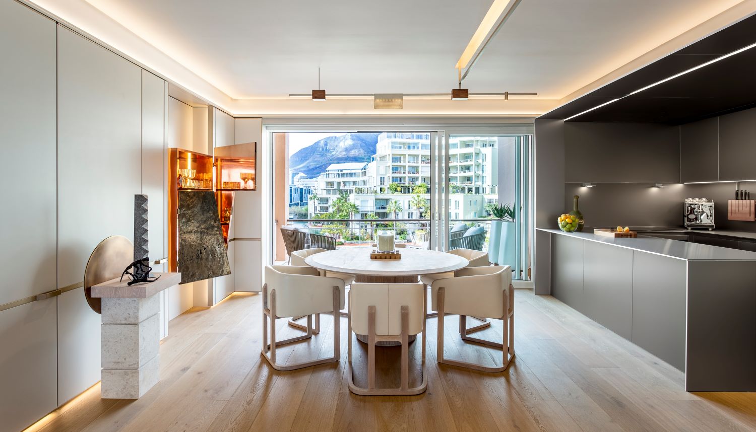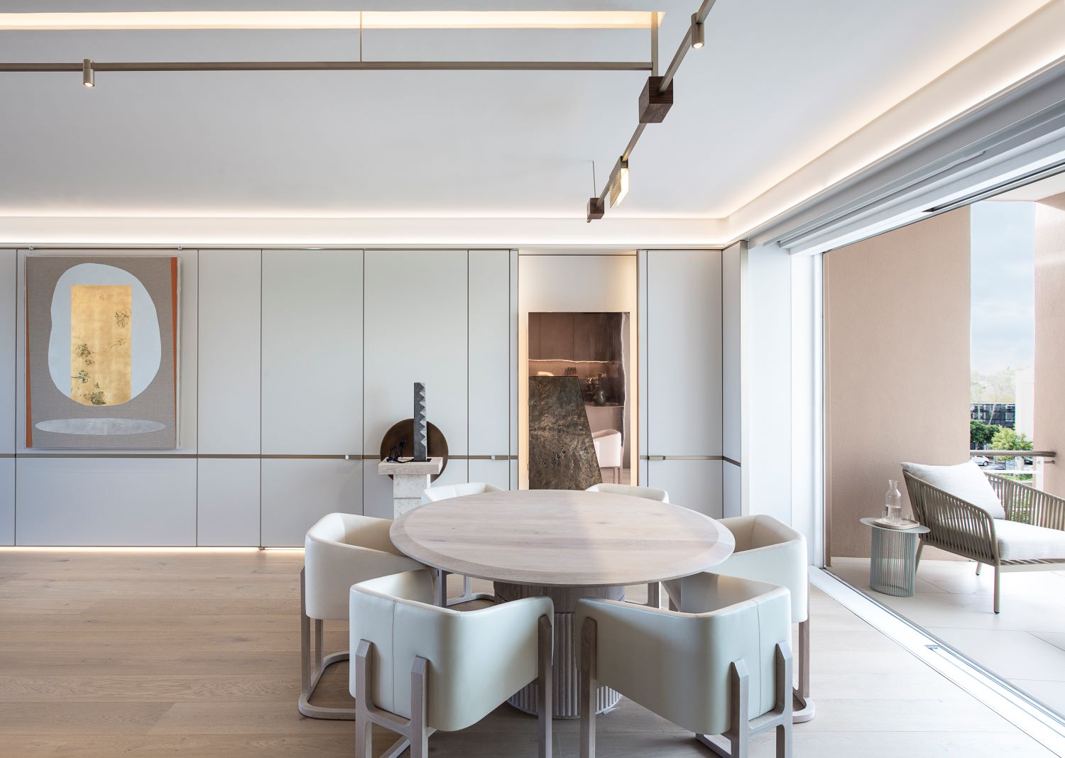 Desde el acabado de mármol acanalado del mueble del televisor y el estriado de la base de la mesa del comedor hasta el borde biselado del tablero, hay una estratificación sensorial que no se impone al carácter limpio y tranquilo del minimalismo.